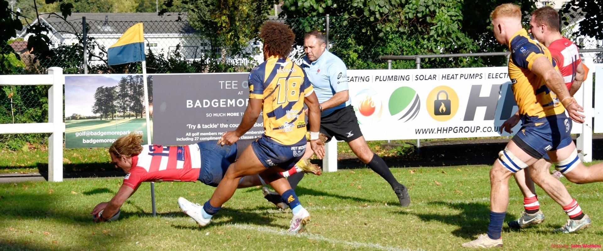 From the outset the Dorking scrum was in the ascendancy - and some! A resultant penalty kick to touch and line-out puts Dorking 45 metres out from the Henley goal line. The ball is neatly popped by George Jackson, the scrum half, to Bryan Hotson on a perfect line - who beats 3 to score. The conversion is missed. 0-5.