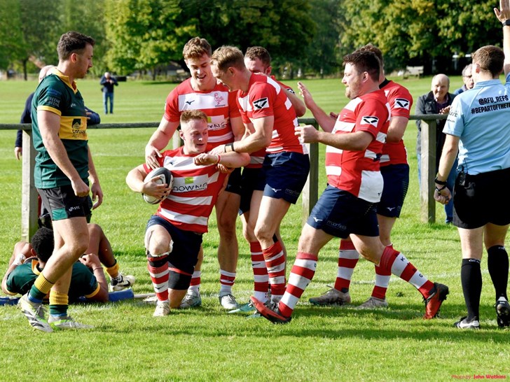 Eschewing their usual slow start, Dorking opened their account on the fourth minute as following a secure five metre line out, skipper Jonny Ellis was on hand to break off from the back of the rolling maul and touch down. With Henry Anscombe on target both with the conversion and, following some back chat to Sir from Bury a penalty restart from the half way line, the home team were 10-0 up. Bury then took the second re-start and immediately had a penalty of their own and they looked to emulate the hosts with a catch & drive line out of their own, held up but illegally by the Dorking Eight. A second attacking line out was disrupted by Dorking but another infringement gave Bury a further penalty, secure this time and the ball was chipped through into space by fly half Ben Penfold. Henry Anscombe won the footrace and secured the ball for Tom Hardwick to clear the Dorking lines and relieve the pressure, only for the Red & whites to commit another foul and give Penfold a simple short range penalty, 10-3.