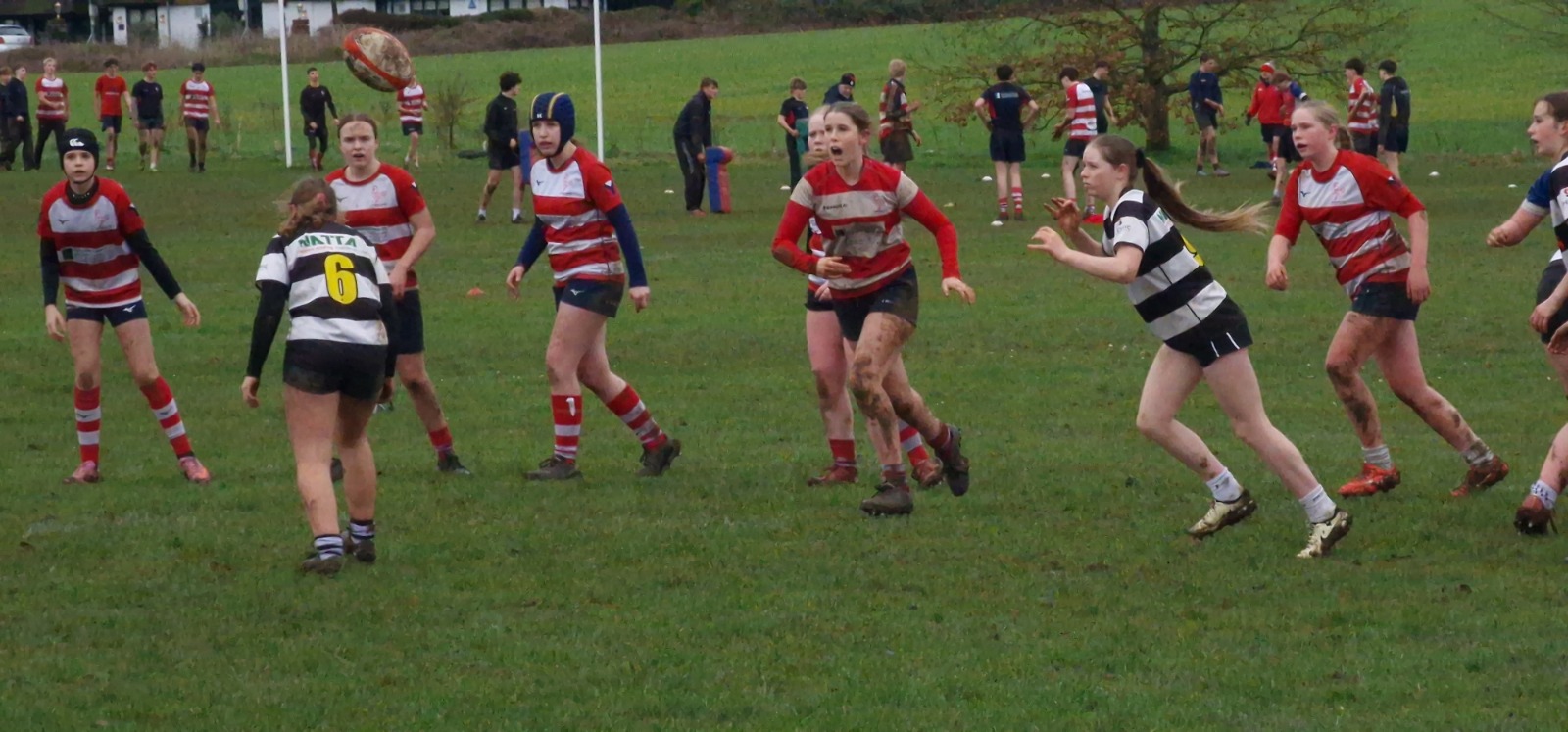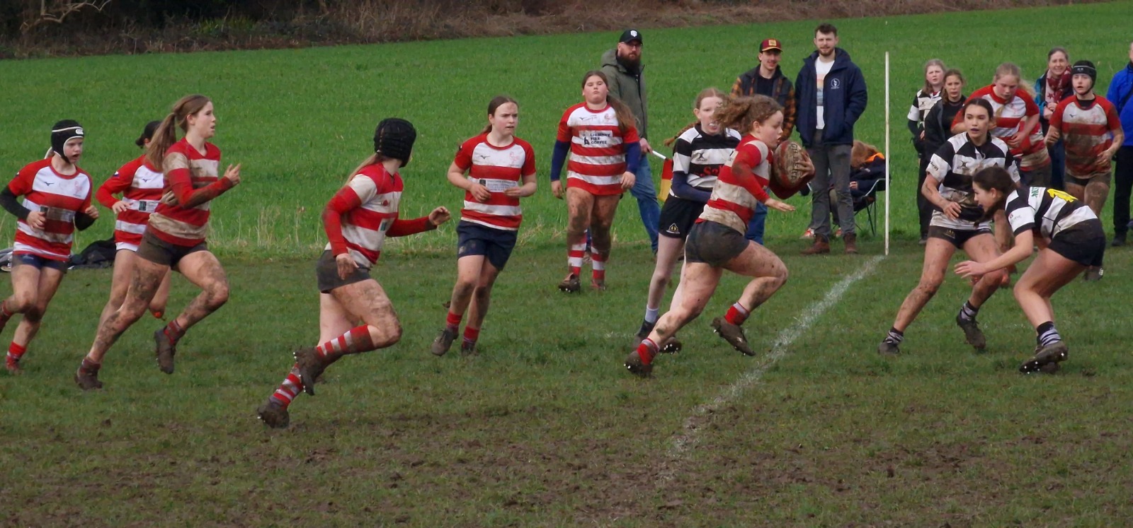 The tone was set straight from the kick off when fly half Rosie Matthews collected the ball and broke from one 22 to the other. The front row of Lola Kane, Oriana Fisher, Sophie Wells and Leah El Bizanti rotated through the match but held a level of dominance in the scrums we rarely see at this age group, putting the taller Farnham front row under constant pressure. The forwards battered holes in the opposition defence, regularly making yards past the gain line and drawing defenders in to give clean ball for scrum halves Emily Carloss (1st half) and Sophia Rodrigues Mann (2nd half) to provide distribution for Matthews to feed the constant threat from centres Evie Powell and Scarlett McSweeney to run at space and tiring defenders. McSweeney continued her prolific scoring rate with 5 more tries, the pick of which was an audacious catch behind her head running at full pace on halfway to glide through the defence and score in the corner. Powell was rewarded with a try in the 2nd half that were fully deserved for her leadership, work rate and strong carries in regularly setting up her centre partner .